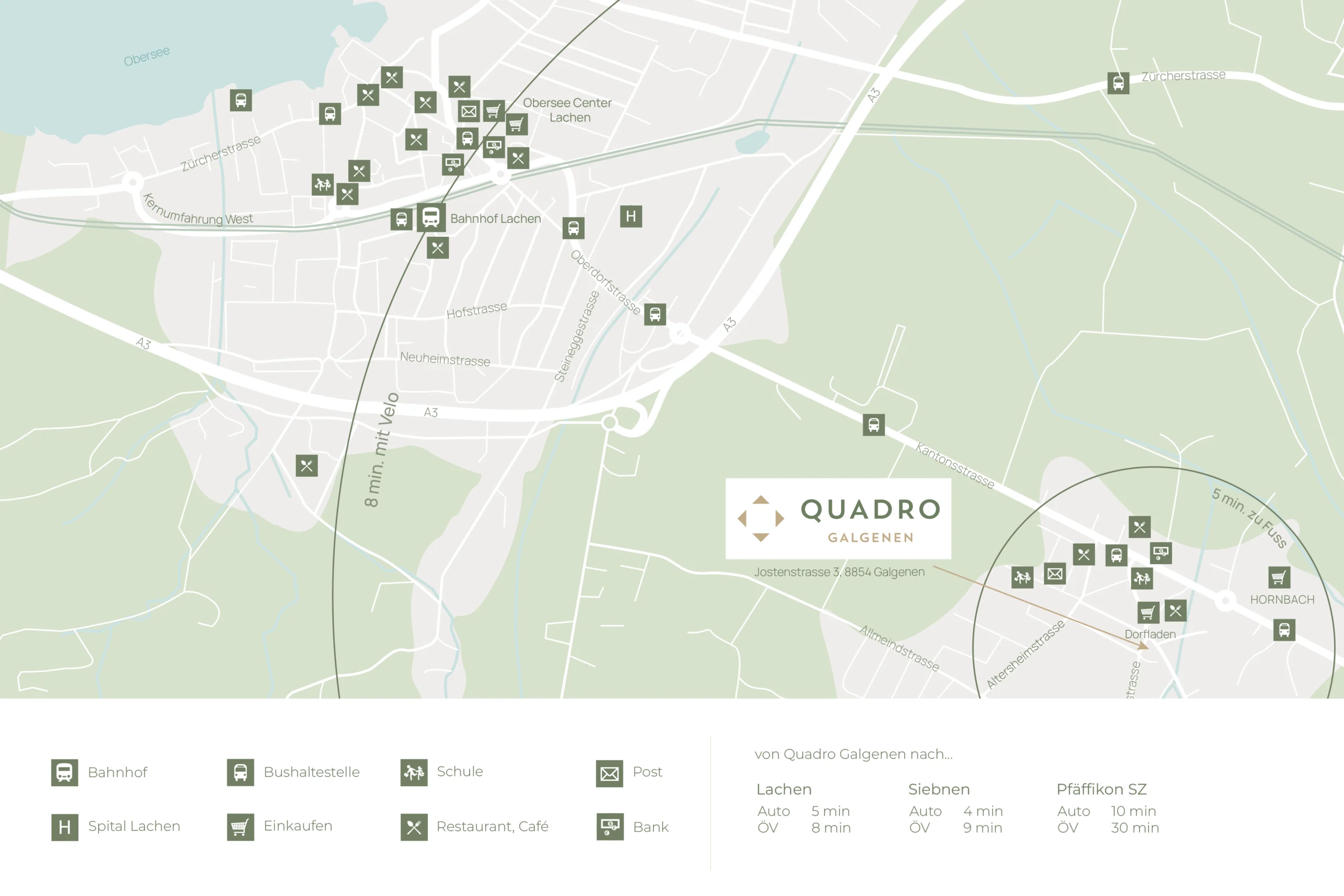 Die Wohnlage von Quadro überzeugt durch eine ausgewogene Mischung aus ländlicher Ruhe und alltagsnaher Erreichbarkeit. Nur wenige Gehminuten entfernt beginnt das Dorfleben: Der Dorfladen bietet frische Produkte für den täglichen Bedarf, das Schulhaus liegt in sicherer Nähe und auch die Bushaltestelle ist in nur 3 Minuten erreichbar. Das Zentrum von Lachen mit seinen Restaurants, Cafés und Einkaufsmöglichkeiten ist in sieben Velominuten erreichbar. Der Bahnhof Lachen verbindet Sie bequem mit dem regionalen und nationalen Bahnnetz – in nur 8 Minuten mit dem Velo oder mit dem Bus.